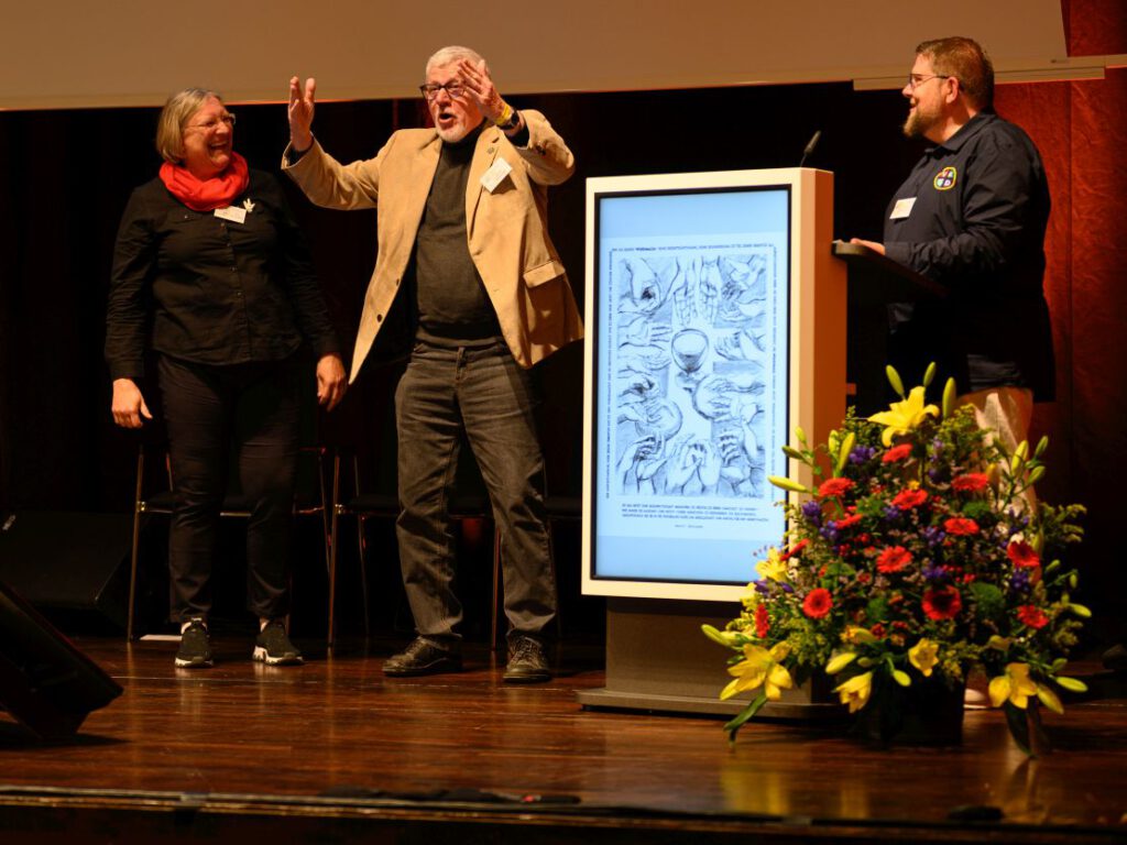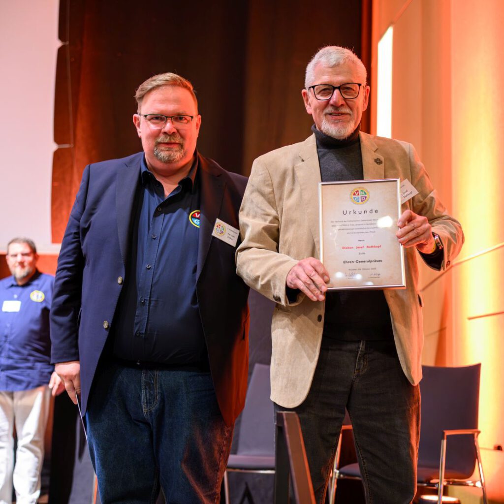 Der VKGD-Vorsitzende Karsten Kißler aus Greven leitete dann zum nächsten Programmpunkt über, einer Ehrung. Nach 22 Jahren als Generalpräses verabschiedeten die Gehörlosen Diakon Josef Rothkopf aus der Nähe von Aachen aus seinem Amt. Er ist selbst hörgeschädigt. Kürzlich war er aus persönlichen Gründen zurückgetreten. In einer liebevoll zusammengestellten Fotoschau ließ der Vorstand sein Leben von der Kindheit über die zahlreichen Stationen seines Berufes und seiner Berufung an den Zuschauenden vorbeiziehen. Und da war viel zu sehen. Beruflich hat er sich durch Aus- und Fortbildungen immer weiterentwickelt. Die Ausbildung zum Diakon war mühsam, aber 1999 wurde er geweiht.