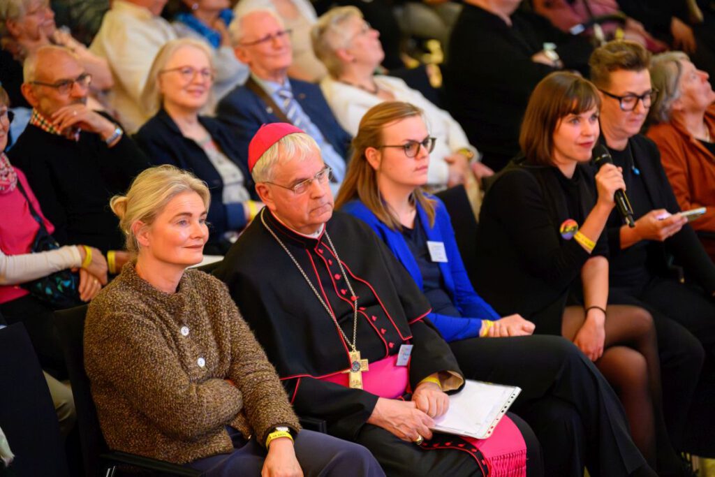 Nach dem Mittagessen kamen die Ehrengäste mit Grußworten zum Zuge. Bürgermeisterin Angela Stähler überbrachte die Grüße der Stadt Münster. Weihbischof Reinhard Hauke aus Erfurt gab die guten Wünsche der Deutschen Bischofskonferenz und des Vorsitzenden Bischof Georg Bätzing weiter. Er erzählte, wie seine Verbindung zu den Gehörlosen begann. Im Priesterseminar gab es eine gehörlose Mitarbeiterin im Priesterseminar. Um mit ihr kommunizieren zu können, lernte er Gebärdensprache. Das führte dazu, dass er bald Gehörlosenseelsorger wurde und bis zu seiner Bischofsweihe blieb. Er gebärdet auch heute noch in Gottesdiensten selbst. Der Gehörlosenseelsorge sprach er seine Anerkennung aus, und er dankte für die vielen Ehrenamtlichen, die über die 100 Jahre den Verband überhaupt erst möglich gemacht hätten.